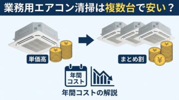 業務用エアコンクリーニングは複数台・定期契約で安い?年間費用を解説 業務用・天井埋込エアコンを2台以上使っていると、「1台ごとの料金」だけでは判断しにくくなります。単発依頼、複数台の同時依頼、定期契約では見積もりの出方が異なり、年にかかる総額も変わるためです。 2台・3台・5台で、1台あたりの費用がどう変わりやすいか 定期契約が向くケースと、単発のままでもよいケース 飲食店・オフィス・サロン/クリ… -