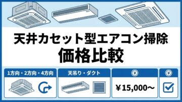 天井埋込エアコンクリーニング料金比較|1・2・4方向と天吊り・ダクト相場 天井埋込や業務用エアコンのクリーニング料金は、単に「業務用だから高い」とは言い切れません。実際は、1方向、2方向、4方向、天吊り、ダクトなどの機種構造と、設置条件の違いで金額帯が大きく変わります。 1方向、2方向、4方向、天吊り、ダクトの料金目安がわかる 自社や店舗のエアコンがどのタイプか見分けるポイントがわかる 見積もり前… -