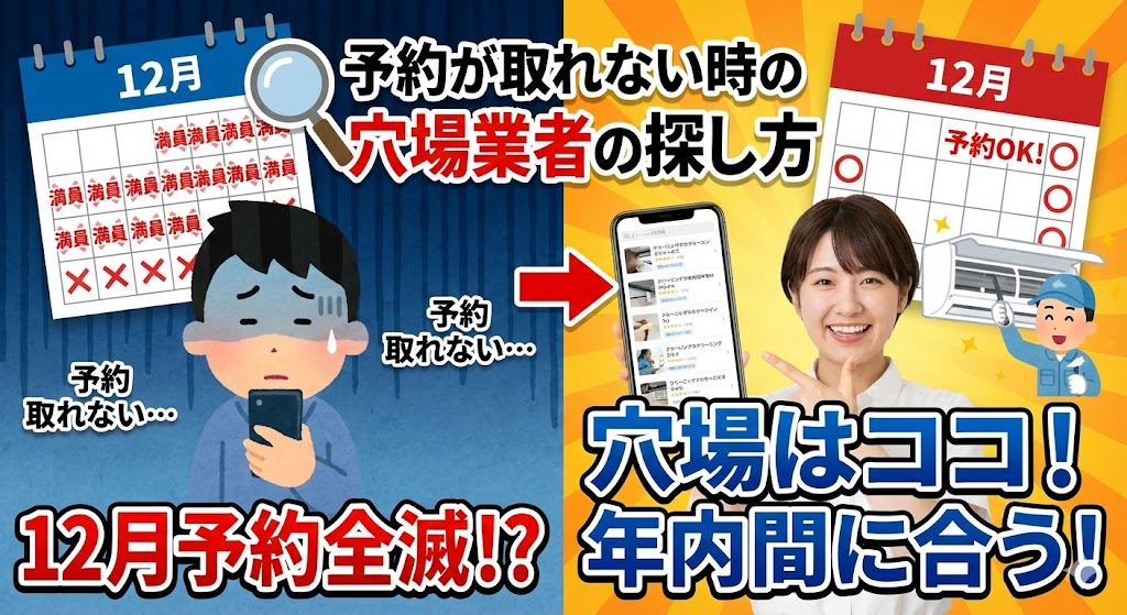 この記事では、エアコンクリーニングの年末予約が取れない時の対処法について、今からでも間に合う穴場業者の探し方、1月の安い時期の狙い方、失敗しない個人業者の選び方を詳しく解説します。