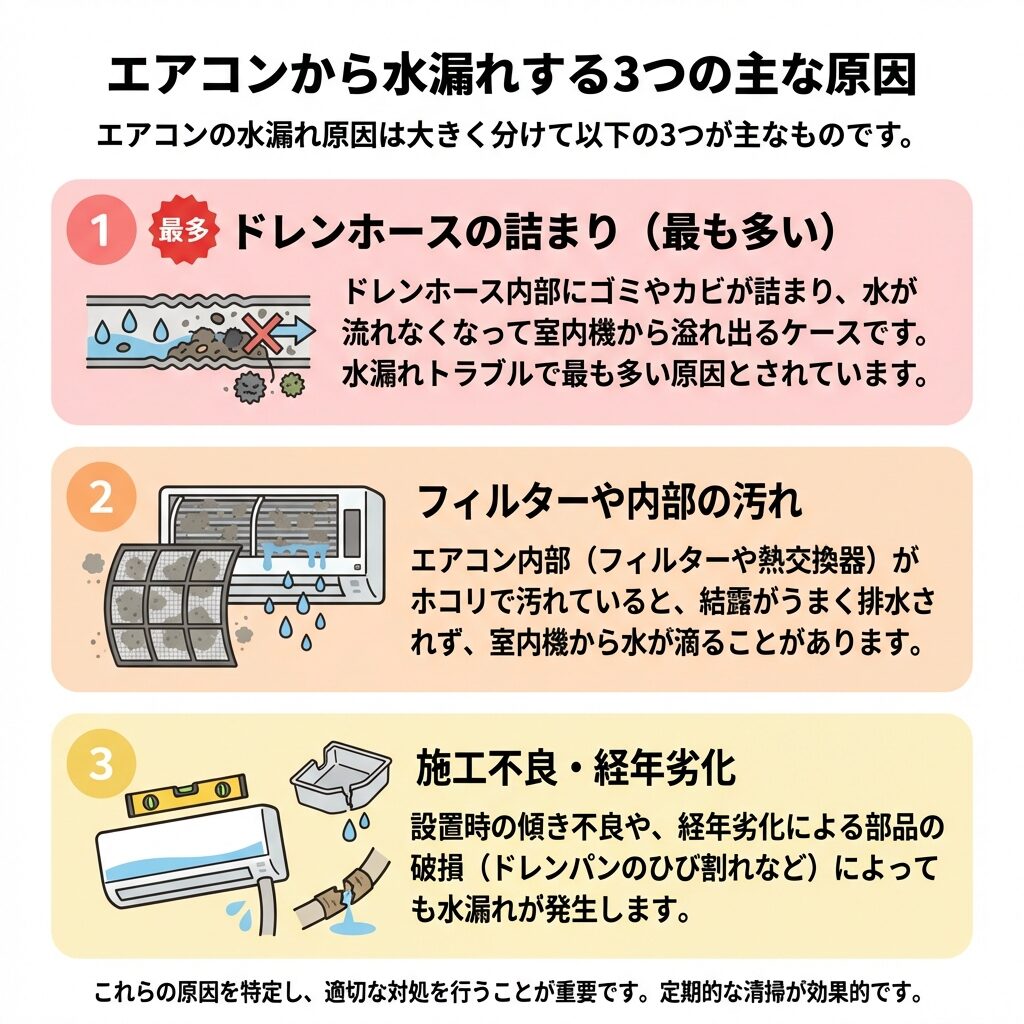 注:エアコンの水漏れにはドレンホースの詰まり以外にも原因があります。この記事では最も多い「ドレンホースの詰まり」に焦点を当てますが、他の原因についても触れながら解説します。