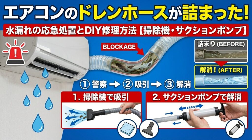 エアコンのドレンホースが詰まった!水漏れの応急処置とDIY修理方法【掃除機・サクションポンプ】