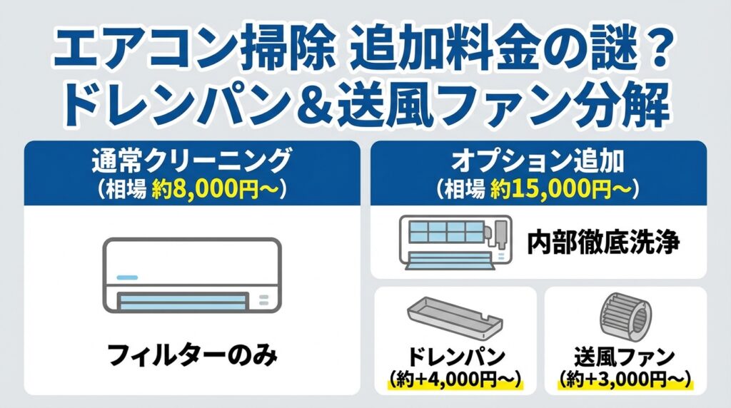 相場記事としては、おうちにプロの解説ページでも、ドレンパン・送風ファン分解洗浄の追加料金を5,000円から8,000円程度の目安で案内しています。一方で、公開料金表の実例を見ると、この帯から上下に外れるケースも少なくありません。ここから先は、通常洗浄との違いと、料金の付き方の違いを整理していきます。