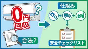 エアコン無料回収は一律に違法ではありません。0円の仕組み、家電リサイクル法との関係、無許可回収や追加請求を避ける確認項目を公式情報ベースで整理します。 -